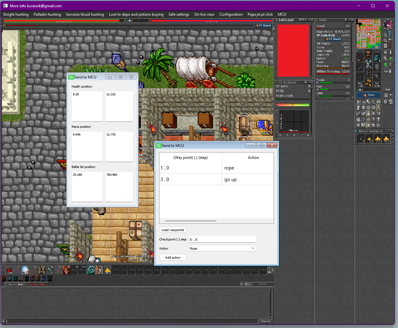 Jeszcze nie wiem. Mam zarys w glowie tak zeby zrobic full afk, opis funkcji jest pokazany na skrenach - np. Knight hunting, sorc hunting, loot to depo, safe options - czyli ucieczka w bezpieczne miejsce, odpowiedzi na chacie, wyslanie emaila w przypadku zagrozenia.