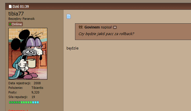 Dodac, ze to jest pierwszy dzien (godziny) serwera to lekko mozna sie bylo wkurwic. Zwlaszcza okolo godziny bylismy bez ZADNEJ iformacji. Nie kazdy siedzi na discordzie, nie kazdy siedzi na otlandzie itd. ja ogladalem stream motha to on mowil jakies niusy z discorda. A tak czlowieczek sobie gra gra gra, jeb wylaczylo serwery. No okej, wylaczylo to zaraz wlacza, cos naprawia i luz. Mija czas mija mija, chuj po okolo 40 minutach mozna bylo na sekunde doslownie sie zalogowac i zobaczyc, ze jednak jest dupa zbita, bo mam 7 lvl 0 many i w ogole komedia. Bylo widac na highscores, ze jedni maja ustawiony juz 7 lvl a inni nie maja. No i po zalogowaniu sie niech bedzie na pol minuty - minute znowu wylogowalo. I po okolo znowu 10-15 minutach juz mozna bylo sie zalogowac od poczatku, od zera, totalny restart, i wtedy juz sie pojawily akcje z tymi ue itd. ja tego nie widzialem bo udalo mi sie fartem spierdolic z temple zanim jeszcze nie zlapalem raka przebywajac z tymi wszystkimi ludzmi i gmami. A no i juz po restarcie kazdy online dostal od gm'a info, ze przepraszaja i ze sie to wiecej nie powtorzy. Inny komunikat byl, ze ci co maja pacca to moge go zwrocic piszac na jakis tam email, a jak nie to dzieki ze zostaja i chyba im zwroca te pare godzin czy nie wiem juz sam. O tak o, pozdro