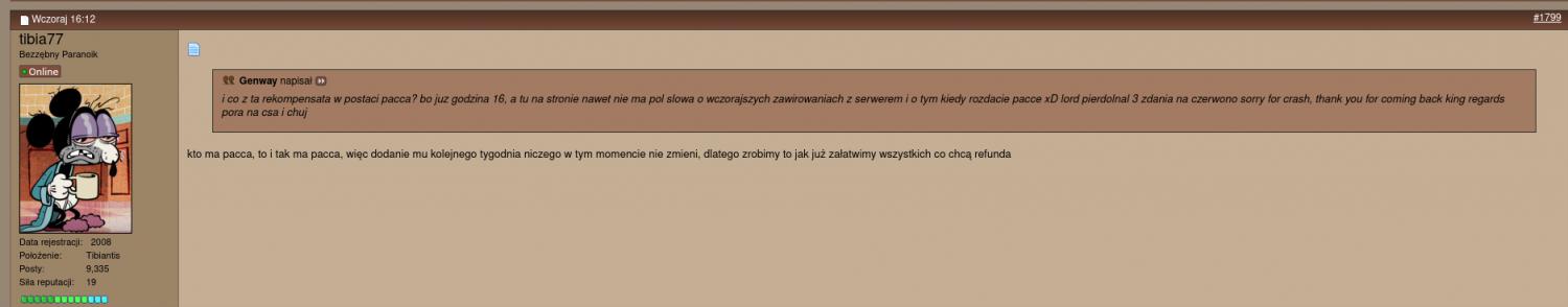 to moze pomysl logicznie, przeteleportuj sie na niewidce i popatrz na cala sytuacje z boku przez chociaz 10 sekund, a nie ze teleportujesz sie do kurwa domku w dwoch gmow i zaczynasz cos wypisywac jak widac golym okiem, ze ewidentnie cos jest nie tak i typy reportujace ewidentnie leca w chuja. jak ktos zglasza bota to tez sie teleportujesz z normalnym widokiem i swiatlem odalonym na pelnej kurwie, czy w takich sytuacjach akurat komenda invisible dziala? brakowalo zebys drugiego npcka obok postawil w tym domku. juz nawet nie wspomne o tym, ze wspomne o tym ze dodanie przedrostkow GOD/GM i dodanie zakladki STAFF na stronie z wymienionymi WSZYSTKIMI nickami administracji/tutorow/helperow to tez chyba was przerasta (i chuj mnie to obchodzi ze kurwa na jakims otlandzie czy chuj wie gdzie byly podawane, powinien byc szybki dostep ze strony do listy administracji, a nie ze ja kurwa bede specjalnie szukal pol godziny kto ma gma a kto tutora) . ots nie ma dwóch dób a juz twoja hipokryzje wzgledem tekanii odczuwa sie na kilometr, jakies zmienianie decyzji co chwile rodem z macius otsa (akcja z paccem najlepsza, w nocy piszesz ze dacie kazdemu pacca, a pare godzin ze jednak nie XDDD), brak jakichkolwiek informacji na temat crasha na stronie otse, nie ma doslownie ZADNEGO nawet mini newsa o tym, a tak naprawde do teraz nie wiadomo co sie dokladnie stalo. post na torgu ze maszyna i chuj, napisz na czerwono przepraszamy i spierdalac xD
