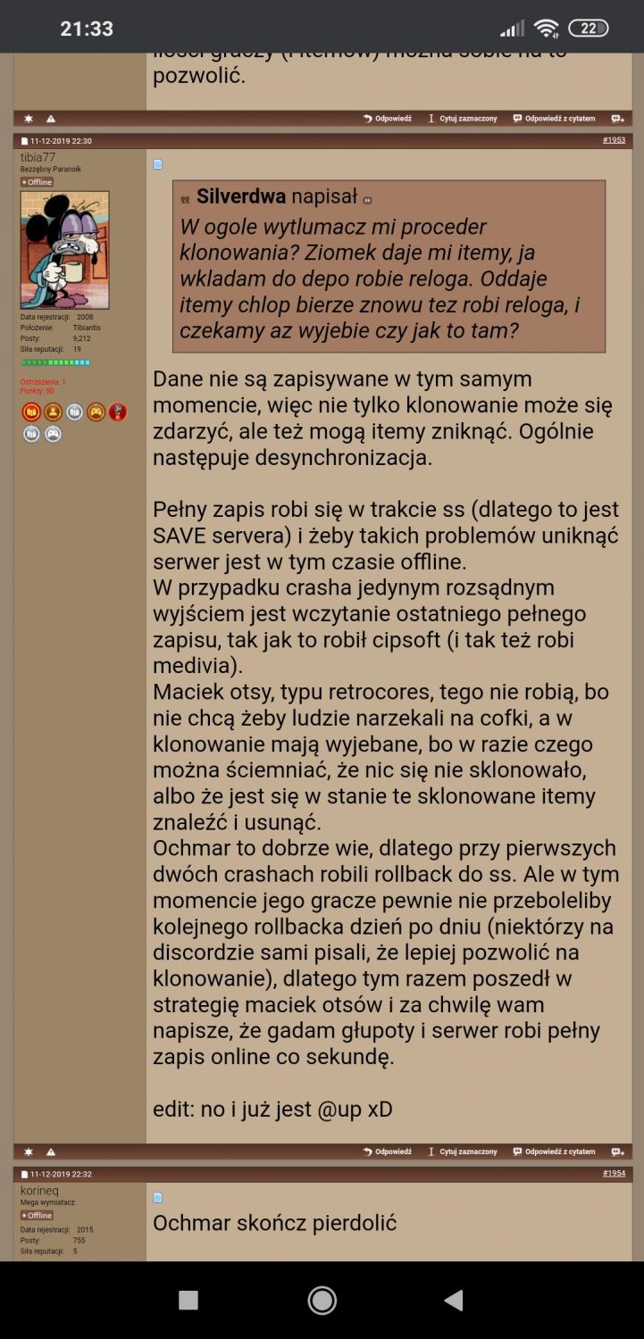 tibiarz twierdzil ze takie cos nie moze dzialac bo moga sie itemy rozklonowac i nie moze podjac tego ryzyka i jedyne wyjscie to cofka do ss i dlatego przed chwila przyznal kazdemu 100gp Xd