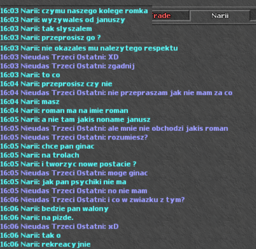 1 akcja bo w następne dni się nic nie działo bo Boruciarz wyjechał, nieprawda - wysłałem list gorylowi, nikogo nie zwyzywałem, spytałem o eq którego Ty nie miałeś i gadasz mi o jakimś romanie którego nigdy na oczy nie widziałem, więc mam wyjebane czy gościu się nazywa roman czy janusz, trzeba było napisać nick a nie gadasz o jakimś romanie XD to ja chcialem wam pomóc na akcjach a nie na odwrót - jak taki kumpel jesteś to trzeba było samemu zapytać romana[?] czy ma eq a nie mi gadasz żebym go pytał jak ja romana to na oczy nie widziałem XD. esa