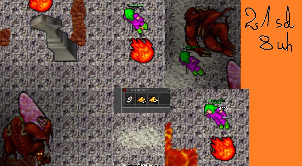 Tutaj porównanie opłacalności solowania Demonów i Magma Beastów, jak widać na powyższych screenach pod względem expa bardziej opłaca się solowanie demonów, ale loot z magma beastów robi wrażenie!