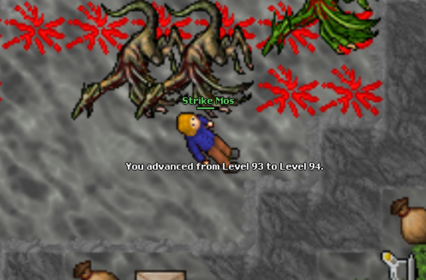 Normalnie siedziałbym na trollach w Ab, jednak z ciekawości wybrałem Thais aby wypróbować Profesorski poradnik. Jakby nie patrzeć dzięki temu była przygoda ze szlamicą, więc już profi-t i z łukiem zdobytym z ciała martwego strzelca poleciałem na cyklopy. Udało się ulepszyć ekwipunek, a konkretnie tarczę.