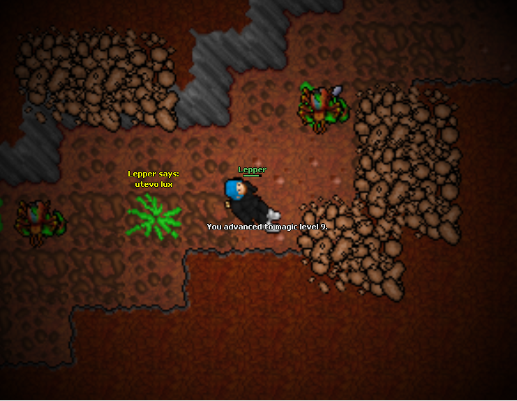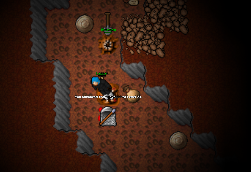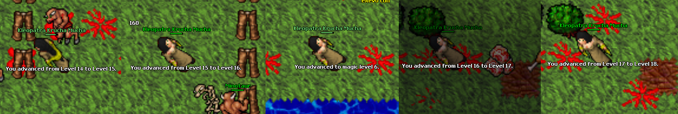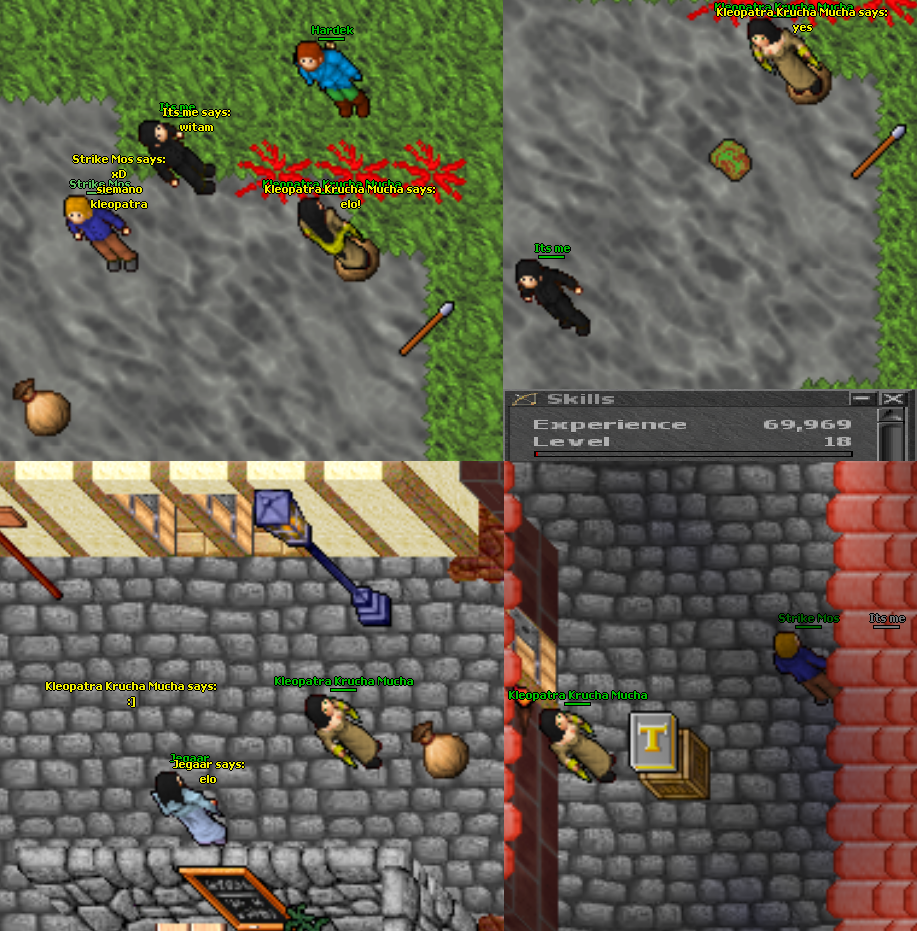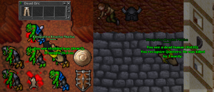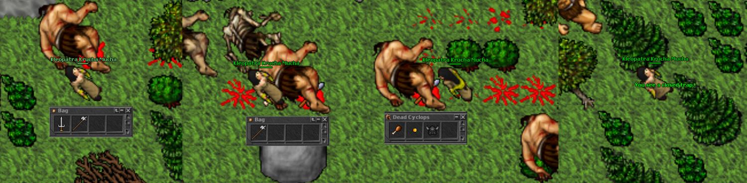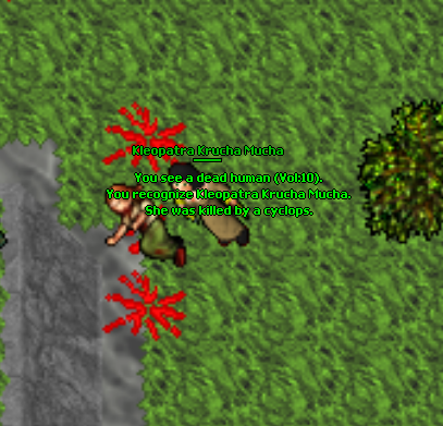 Tibiarz wie, że Kleopatra jest wybrańcem, więc podrzuca jej do ciał brass armory, halabardy (2 w ciągu kilku minut), a nawet trapa za drzewo. Teraz to włócznie dookoła krzaków w połączeniu z sidłami mielą jednookich jak w masarni, szkoda tylko że dopiero pod koniec ostatniej sesyjki ją znalazłem. Drugi hełm też się przyda na wypadek przygody podobnej do tej, która spotkała nieszczęśnika powyżej.