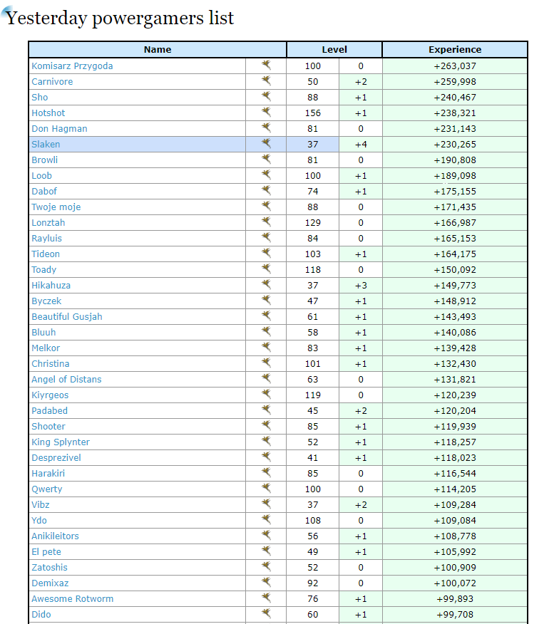 huja an ie wolniej expisz bo respy sa okupowane na ogol przez te same osoby ktorzy maja psyche i checi zajmowac respa a potem siedziec 16h+ czy po 100h+ bez przerwy na 1 respie sharujac chara i te osoby maja wiekszy xp/h niz normalnie jeszcze jakby sie tu ludzie wpieprzali na kazdy resp i go wybijali to moze bym sie zgodzil ze wiekszy online utrudnia pg