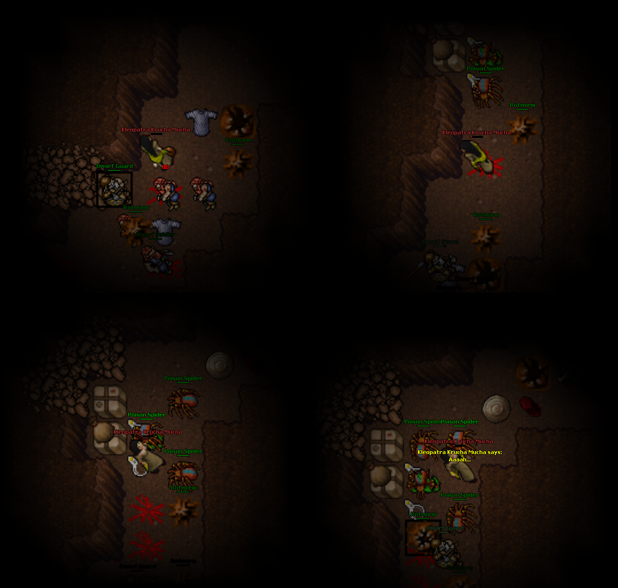 Radosna eksploracja zderzyła się jednak z gniewem potworów coraz częściej wychodzących z ciemności. Plotki głoszą, że to właśnie spora ilość aktywnych poszukiwaczy przygód przemierzających świat Tibiantisa rozjusza potwory, przez co częściej wychodzą ze swych kryjówek. Nie rzucał słów na wiatr Adposrator mówiąc że w następnych zawodach muchę pokona. Widząc że szlamice nie stanowią już zagrożenia dla Kleopatry wysłał swojego najwierniejszego sługę – strażnika krasnali. Ten zaatakował z ciemności i zza pleców, boleśnie gruchocząc ciało kruchej jednak królowej egiptu, podczas gdy żołnierze bezlitośnie szyli z kusz. Inne potwory blokowały drogę ucieczki Kleopatrze i tylko dzięki wrodzonej zwinności udało się jej uniknąć śmierci. Tutaj też został użyty kolejny przedmiot ze spadku martwego strzelca (po którym Kleopatra przejęła łuk), a konkretnie mikstura życia.