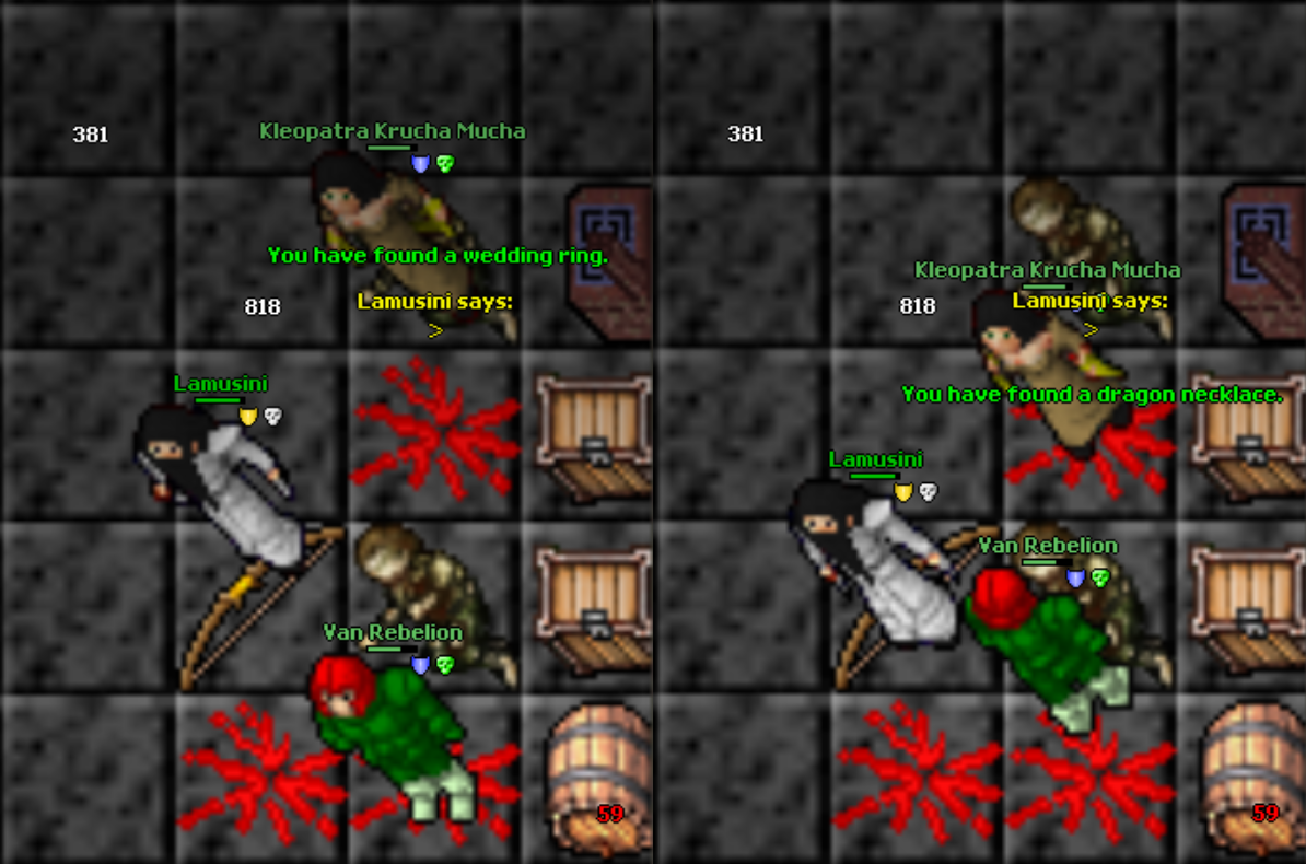 Tibiarz znowu nie pobłogosławił, ani smoczą tarczą, ani płytowymi nogawicami czy pancerzem z Valkyrii, ani innym przedmiotem, który by ulepszył obecny ekwipunek. Zamiast tego spadły 3 podwójne topory, amulet ochronny i kryształowy naszyjnik :nosaczsmutek